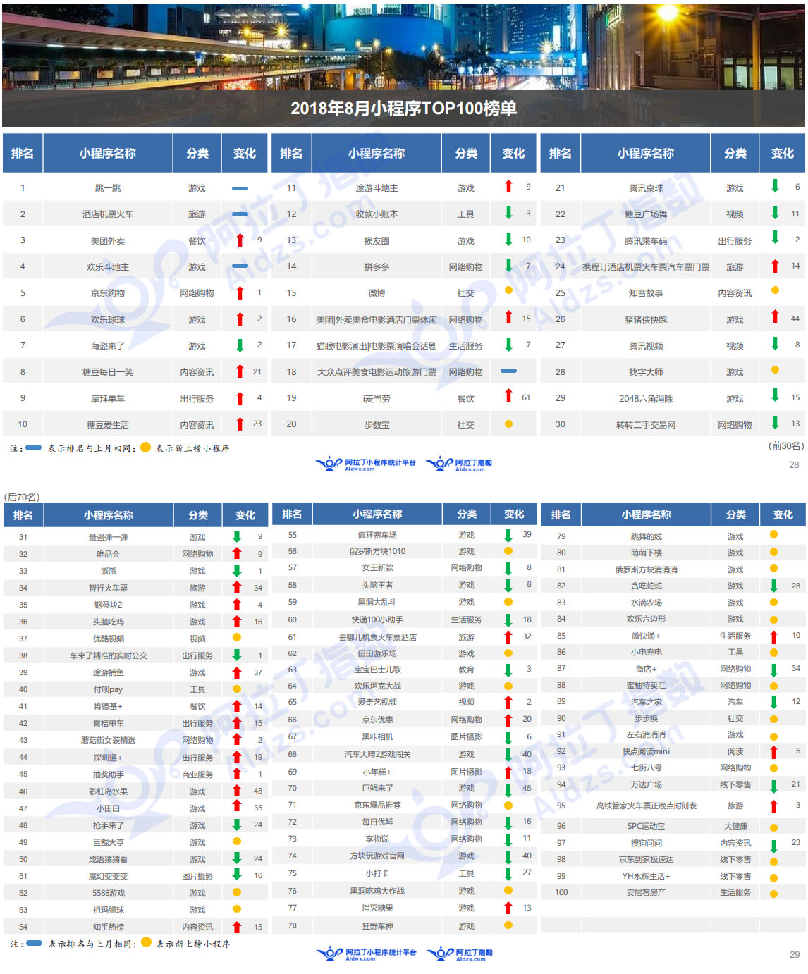 与此同时,昨日阿拉丁还发布了《2018年微信小程序8月TOP100榜单》。据榜单统计显示,小游戏是上榜数量最多的品类:总共有42款小游戏进入TOP100榜单,占据比例近半。