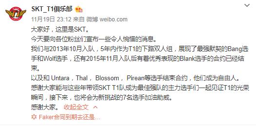 昨天晚上,SKT官方俱乐部传来消息,大量选手成为自由人,目前除Faker以外,其他主力人员均成为自由人。SKT T1的下路双人组Bang选手和Wolf选手,还有打野选手Blank的合约已经结束。 Untara,Thal, Blossom, Pirean等选手也结束了合约,成为自由人。