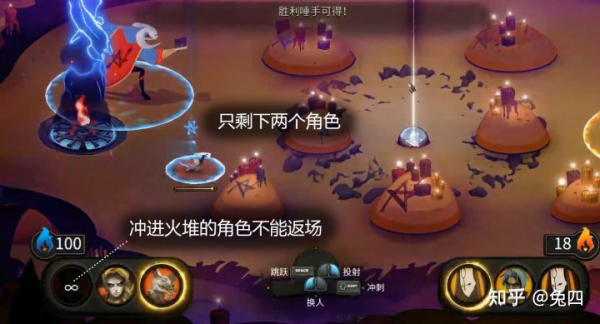 所以,大家可以把《Pyre》看作一个3V3的篮球游戏把球抢到、投进对面的火堆就能得分,然后如果带球直接突破进去灌篮(也就是冲进火堆),就能得到大量分数。一般来说,因为投篮需要蓄力和飞行,所以当对方投篮时,防守方是比较容易去拦截的;相反,灌篮是进攻方带球高速突破,因此灌篮不仅分数高还不容易拦截。