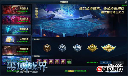 在《黑域战界》中,玩家需要到达235级,才能开启法阵系统,此外,使用对应的法阵进阶石,可升阶法阵,等阶越高,属性越高。法阵资源副本可产出法阵进阶石,越高等级的法阵资源副本,产出的进阶石种类越多。