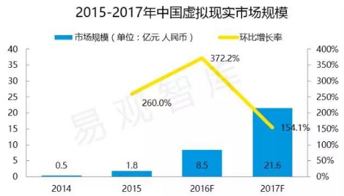 2014 年至2016年VR游戏市场整体呈跨越式增长,2016年VR游戏市场规模将达到8.5亿元人民币,这主要源自于游戏市场整体仍处于稳固增长态势,市场格局趋于稳定以及核心游戏用户的深度需求。此外,厂商寻求突破,深耕其他游戏领域,力求打破大厂控场的格局。预计2017年,中国VR游戏市场规模将达到 21.6亿元人民币。