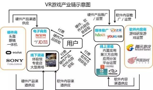 我国VR游戏产业链初步形成,未来极有可能拓展新的产业链细分市场。目前,产业链由硬件与内容组成整个上游部分,线上、线下、媒体、电商四部分组成中游渠道来对应下游用户。初步形成一个完整的产业闭环。