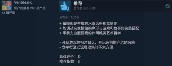 这款游戏在Steam上有96%的好评,玩家大多数认为游戏画面精美、音乐典雅,玩法和解谜比较简单,相较而言更像是“可互动艺术动画短片”。游戏内将关卡分为红绿蓝黄4个主题,分别对应废都戈壁、森林、海洋和月下宫殿,并结合音效与配乐来渲染气氛,与玩家形成情感共鸣,使得游戏虽然没有文本内容也能让玩家感受到游戏想要表达的感情,得到艺术欣赏般的体验,从而给予游戏好评。