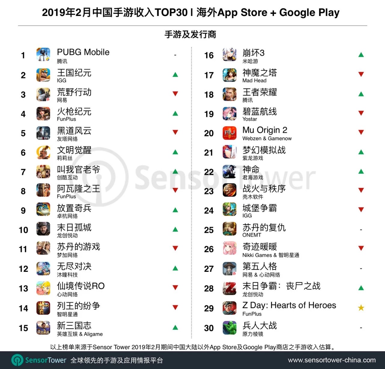 近日,移动数据分析平台Sensor Tower公布了2019年2月中国手游产品在海外市场收入Top 30榜单。