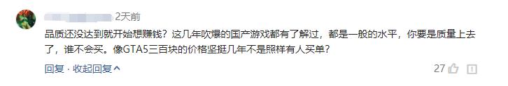 对于为何不愿买国产单机,有玩家表示:“品质还没达到就开始想赚钱?这几年吹爆的国产游戏我都有了解过,都是一般的水平,要是质量上去了,谁不会买。像GTA5三百块的价格,坚挺几年不是照样有人买单?”