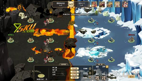 遭遇战场景比较简单,画面上方,两侧分别显示双方的英雄,中间显示战斗倒计时的剩余时间。画面中间的空地是英雄们的战斗区域。