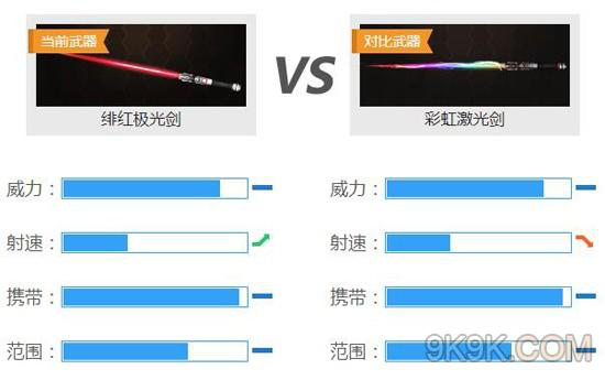 和彩虹激光剑、激光剑相比,绯红极光剑与它们在威力、携带和范围属性上不相上下,而速度上则有占据更好的优势。