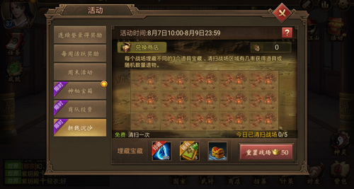主公们可通过自由选择战场区域,进行一番彻头彻尾的清扫,每次清扫都有几率获得珍稀道具。每个战场均埋藏不同的3个道具宝藏等你收割,例如武魂、武将包碎片、宝箱等,重置战场则会随机刷新埋藏道具。眼看诸多奖励就在面前,主公们怎能不放手一搏见分晓?