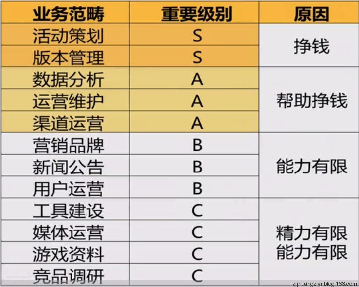 一般来说,一个运营团队会把最优秀的资源分配给S / A,能力一般的团队只能照顾好S / A级业务,只有对于有积累、有精力、有追求的运营团队,才有多余的精力把业务覆盖到B / C,因此这些团队往往拼的是B / C业务的实力。