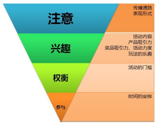 游戏运营需要活动,确定了活动的目的,我们接下来就可以来进行具体的活动策划了。之前我看过一篇很不错的文章,作者将活动参与归结为一个活动策划漏斗,注意 - 兴趣 - 权衡 - 参与,缩写为AIBA(attention-interest-balance-action),如下图所示: