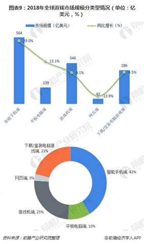 分类型来看,移动游戏(智能手机及平板电脑)成为最大的游戏细分市场,2018年将产生703亿美元的收入。这将是移动游戏首次占据全球游戏收入一半以上的份额,即51%。在移动游戏收入中,80%或564亿美元将来自智能手机游戏,平板电脑游戏将产生其余的139亿美元。