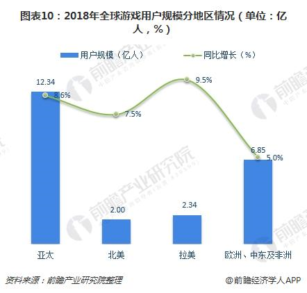 用户规模方面,随着网络渗透率的不断提高及智能机的快速普及,2018年,全球游戏用户将达到24亿人,同比增长7.6%。其中,亚太地区拥有全球半数以上的游戏玩家,约为12.34亿人,同比增长8.6%;拉美作为新兴市场,消费者信心正逐步恢复,游戏用户增长有望超出全球平均水平,达到9.5%。