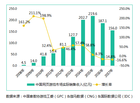 随着游戏产业进入移动时代,页游在市场中的地位一度被唱衰。由中国音数协游戏工委(GPC)、伽马数据和IDC共同发布的《2017年中国游戏产业报告》显示,2017年中国网页游戏市场实际销售收入156亿元,同比下降16.6%。在页游产品看起来吸引力逐渐降低、新品也逐渐减少的情况下,许多曾以页游起家的游戏公司纷纷“页转手”。