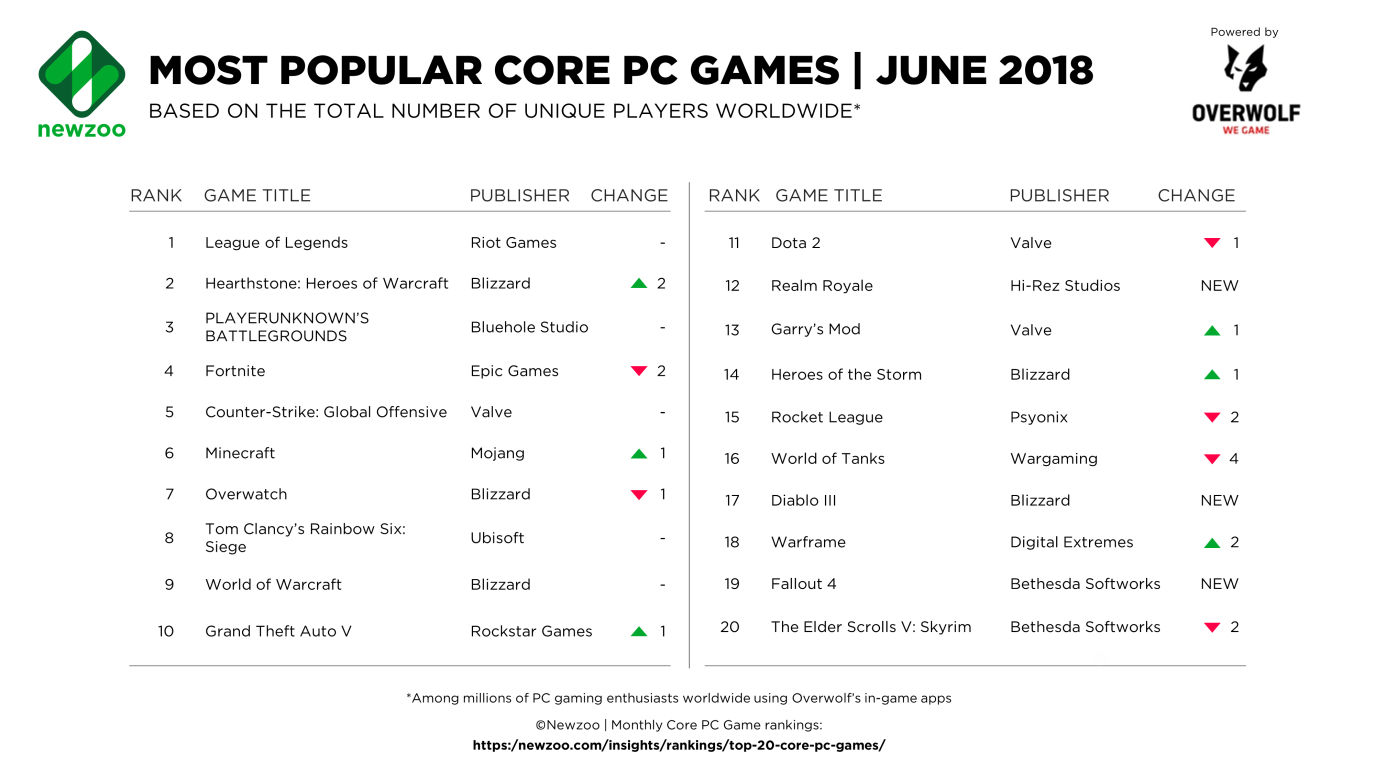 在最受欢迎的 20 款核心 PC 游戏排名中,《炉石传说》跃至第二名(较 5 月上升了 2 个名次),这可能是由于该游戏在 6 月 5 日发布了游戏 11.2 升级版,增加了各种新功能、进行了 bug 修复和游戏改进。此外,《堡垒之夜》(Fortnite)下滑至第四名(较 5 月下降了 2 个名次),而 PUBG 依然保持第三位。PUBG 在 6 月的强势地位可能是由于其在 6 月 22 日发布了备受期待的 Sanhok 地图。