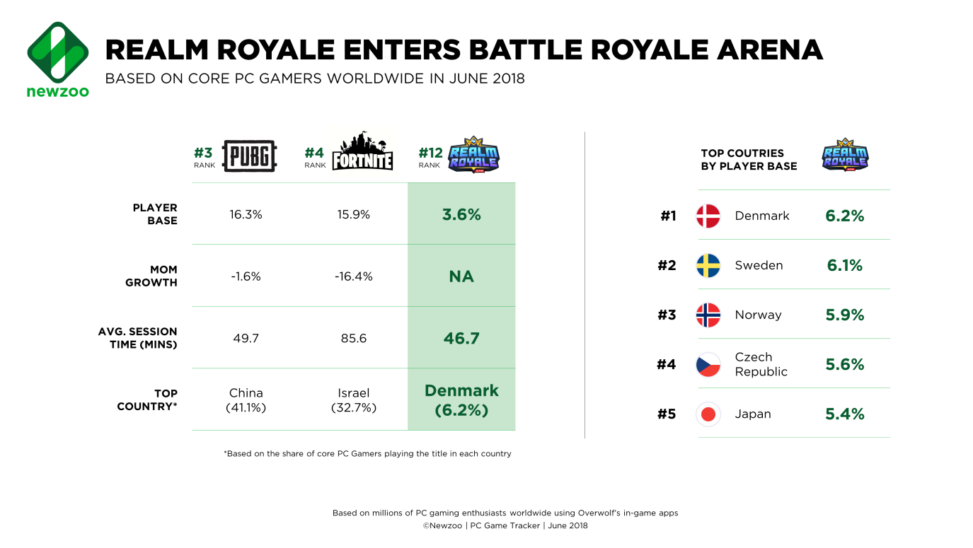 今年 6 月,Newzoo 对 PC 端游戏追踪进行了深入的研究,并将关注的焦点转向 Hi-Rez Studio 旗下免费大逃杀新作 Realm Royale,这款游戏目前已进入最受欢迎的 PC 游戏排名的前 20 名中。