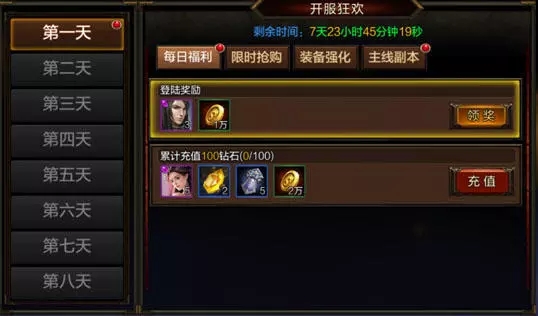 配合开服狂欢活动,每日提供登陆礼包来激励玩家登陆。一般是个连续8天的登陆礼包,2日、3日、7日会投放价值较高的标的物,鼓励玩家登陆。