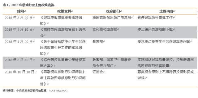 出于对青少年保护以及规范游戏市场的竞争秩序等现实因素的考虑,在2018年政府部门出台了多项政策和措施对国内的游戏市场进行规范和整顿。其中影响比较重大的政策文件是2018年初发布的《游戏申报审批重要事项通知》。随后,游戏版号审批工作暂停,直至12月才恢复审核,在此期间新游戏无法上线并进行商业化;在8月,《综合防控儿童青少年近视实施方案》发布,要求“实施网络游戏总量调控,控制新增网络游戏商务运营数量”,这份文件传达了更严格的游戏控制监管政策,对各大游戏厂商均造成一定影响。