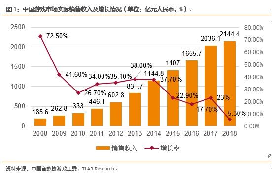 过去的2018年是中国游戏行业不平凡的一年,根据中国音数协游戏工委(GPC)发布的《2018年中国游戏产业报告》,2018年中国游戏市场实际销售收入达2,144.4亿元人民币。然而,在2008年-2017年间游戏行业的市场销售收入增长都维持在15%以上,在2018年游戏行业的市场销售收入增长却仅为5.3%,创下过去十年的历史新低。这也意味着当前的游戏行业已经告别了过去的高速增长阶段,需要寻找新的增长点。
