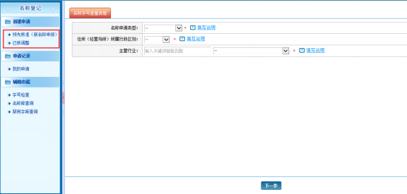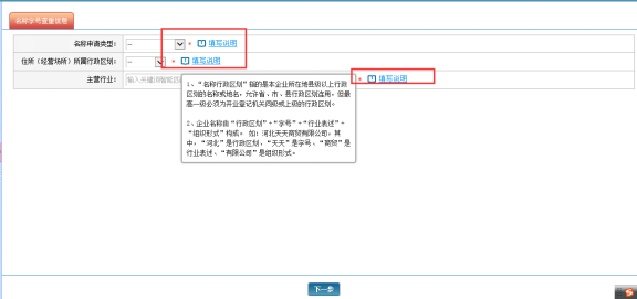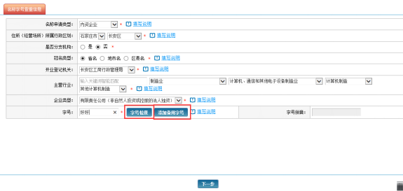 信息填写完后,先点击“字号”右侧的【字号查重】按钮确保所输入的字号能使用,点击【添加备用字号】添加备用字号(最多可以添加3个备用字号),然后再点击页面下方【下一步】按钮进入到下一步页面进行详细信息的填写。