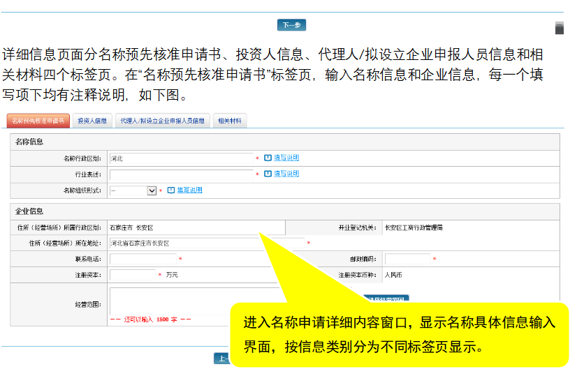 详细信息页面分名称预先核准申请书、投资人信息、代理人/拟设立企业申报人员信息和相关材料四个标签页。在“名称预先核准申请书”标签页,输入名称信息和企业信息,每一个填写项下均有注释说明,如下图。