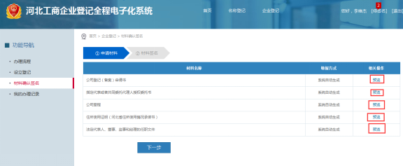 用户点击左侧的材料确认签名按钮,进行材料签名操作。页面上默认显示所有待确认签名的企业信息,也可以输入查询条件,比如申请日期、申请类型、企业名称等多种条件,点击【查询】按钮,可查询出满足查询条件的企业申请信息。然后在“查询结果”列表下点击【签名】按钮进行全体股东签名确认。在申请材料一栏,预览所有的申请材料,如下图。