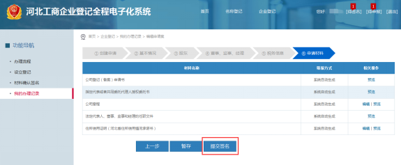 预览完所有的申请材料,对公司章程和住所使用证明进行编辑、填写完毕后,点击【提交签名】按钮将设立登记申请信息提交,并可进行全体股东、法定代表人签名确认(如果设立董事会、监事会的,那么董事和监事也需要签名),如下图: