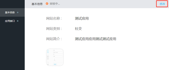 应用详情页面可点击“修改”来编辑应用“基本信息”和“平台信息”。