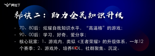第二个选择赛季的模式,头脑王者是一个答题类节目,大家对内容的更新是有诉求的,如果很多用户一直在答一套题目用户会失去新鲜感,我们会采取赛季的模式,每一个月更新赛季,所有段位进行重新排名,给用户一个重新的追求。之后我们设计头脑王者2,我们吸取了在头脑王者1的问题,比如头脑王者2把所有的答题匹配变成3V3的开黑模式,整体排名也是3V3的排名,这是为了解决最早的问题。