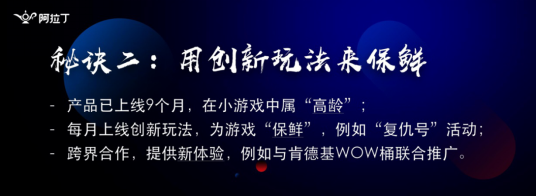 第一个是大众题材。第二个通过社交玩法破冰拉新。第三个运营建立长期的新鲜感。利用群组来拉升游戏数据,我们整个小游戏是寄生于微信的社交体系,天然的小游戏具有很强的群组运营能力。
