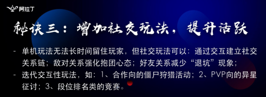在我们的游戏设计中每一个月我们就要研发一款新的能够跟主线相关的小型的游戏玩法,大家可以想象每一个月我们的产品运营团队都要创立一款新的小游戏,而且这款小游戏能够有效的跟我们的主线进行结合,这也是对于整个游戏的运营后期比较重要的要求。