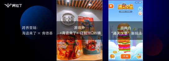 我们在游戏内开发了一个大家以前都玩过用陀螺仪接汉堡的这么一个小游戏,肯德基在WOW桶上给了我们很多的品牌曝光,我们在游戏里面产生的所有积分排名收益用户可以兑换肯德基线下的食物代金券,如果购买肯德基的WOW桶也可以得到海盗来了的道具。