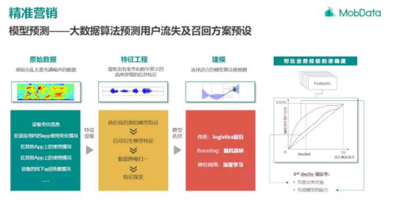 过去所谓的数据决策分析,实际上是利用那些与决策相关的数字来分析,不能等同于今天的大数据分析。数字是结果,大数据是预见。大数据分析除了需要用到相关的数字,还需要其它表面上毫无关联的数据,需要海量的碎片化信息。如何在海量数据中洞察每一个客户,并精准地预测他们的需求呢?比如说MobData大数据平台:(主要以数据服务、数据应用、数据合作为主的全景数据服务平台)MobData平台以Mob开发者平台五年多海量数据为基础,与不同场景结合,利用海量的数据完成对客户的画像刻画,再将合适的产品介绍给合适的人,比如说手游,过去普通的营销模式投入200万可能只能拓展5%的市场规模,但是通过大数据精细化营销同样的投入200万可以拓展出15%的市场规模,甚至更高。