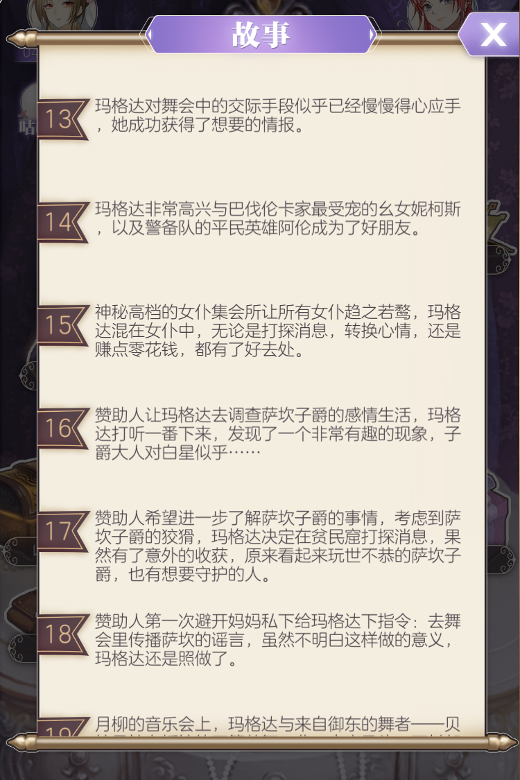 游戏在一开始就会告诉你,你之所以被收养,被安排背负复兴家族的任务,背后都有一名神秘赞助人的支持。并且被选中培养的小姑娘不止你一个,而受到某个意外的影响,你提前登上了这个隐藏着阴谋的舞台,像个提线木偶一样被牵引着旋转。