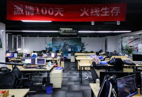 风际游戏的旧办公室也在软件园,屋中挂着“激情100天,火线生存”的标语。摄影:润程