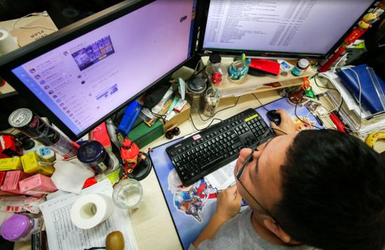 2018年10月11日,游戏公司余香科技,一个年轻人正在紧张地工作,桌子的一角摆满了各种饮料。摄影:润程