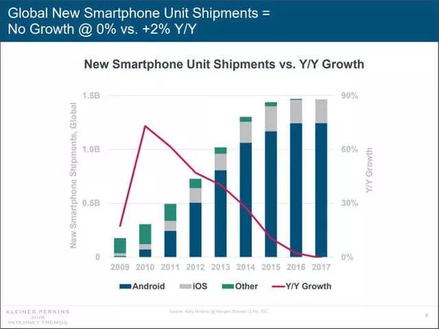 智能手机手机市场格局已定,国内主要被苹果、华为、OV和小米瓜分,更为关键的是经过这几年的发展,手机市场的增长空间有限,根据最新的“互联网女皇”玛丽?米克尔发布的互联网趋势报告,2017年全球智能手机出货量增长为0。