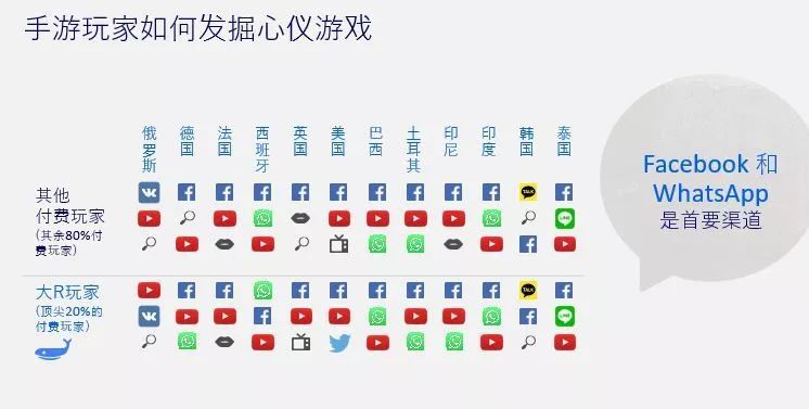 全球12国调查显示,大部分国家的付费玩家(包括大R玩家)在搜索游戏时,均会首选Facebook和WhatsApp。也就是说,在覆盖高价值玩家方面,Facebook具有明显的先天优势。