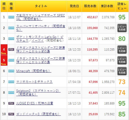 12月26日晚间消息,日本游戏媒体4Gamer援引Media Create数据表示,《任天堂明星大乱斗》上周销量达到45万份,迄今发售三周总销量超过200万份,提前锁定日本地区最畅销主机游戏宝座。