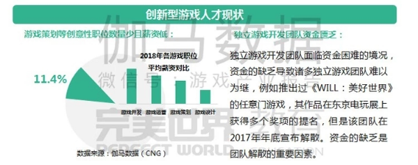 伽马数据(CNG)统计的相关数据显示,2018年,中国游戏产业从业者约为145万人。但是缺乏创新型的人才依旧是游戏产业所面临的严峻问题,第一,从业者职位构成分布数据显示,游戏策划类的从业者数量最少,相比游戏开发以及游戏运营类的职位,游戏策划与设计职位的平均薪资也较低;第二,国内仍缺少对于游戏策划的系统培育手段,造成相关人才的缺失;第三,生存环境决定创新风险较高,除了部分游戏企业为求稳妥,常用传统研发和运营套路为重要策略外,以创新为亮点的独立游戏领域也存在困扰。以Steam上销量超过一百万的《太吾绘卷》为例,曾因经费缺乏等问题,导致程序员流失,制作人补缺,无法专注于创新。与国内相比,国外在培养创新型游戏人才更有经验,结合当前情况看,大量人才赴国外学习尚需时日,而国内培训机构与国外机构或高校的合作将是较为现实的创新型游戏人才培训的重要途径,例如完美世界教育与阿伯泰大学深度合作,火星时代与北美著名数字艺术学院深入合作等等。