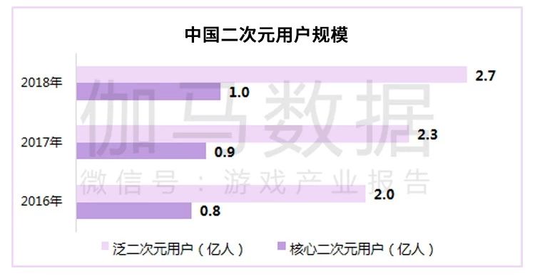 二次元是指由动画(Animation)、漫画(Comic)、游戏(Game)、小说(Novel)组成的文化圈,但不限于 ACGN,还包括从 ACGN 向外延伸出的手办、COSPLAY 等衍生产物。据伽马数据推算,2018年中国二次元用户规模达3.7亿,其中泛二次元用户2.7亿人,核心二次元用户1亿人。国内二次元产业的不断发展,为二次元游戏的发展奠定了基础。