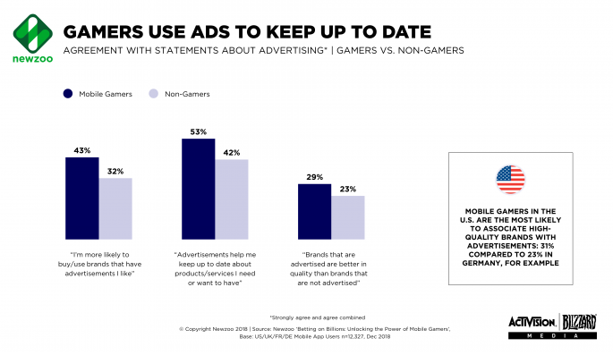 与非游戏玩家相比,手机游戏玩家更容易接受广告宣传。例如,他们更有可能从他们喜欢的拥有广告的品牌购买商品,利用广告来保持对产品和服务的关注,并将广告与优质品牌联系起来。