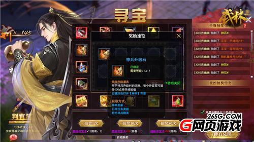 准备就绪后即可操作,目前有抽奖1次、10次、50次三种选项,积攒对应数量的寻宝卡即可进行抽奖。奖励内容非常丰厚,有神兵升级石、神兵资质石、升阶石材料、极品宝石、侠客培元丹、神石、海量银两、龙纹碎片等丰厚道具,最令人兴奋的必然是红装、极品神兵和顶级侠客,不得不说内容还是非常诱人的。