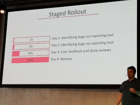 这样的做法还让开发商有机会核实玩家反馈,并且在向所有玩家推出之前了解应用商店页面的评价,通常这样的阶段性测试会持续四天:更新第一天,先让1%的安卓玩家体验更新,第二天增加到5%,第三天增加到20%,第四天增加到100%,同时推向所有iOS用户。