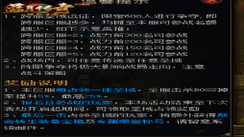 在战场内,摧毁战旗最后一击的玩家所在的区服,可以获得战旗的归属,也就是圣域的暂时的归属权。可是千万别松懈,因为在活动期间战旗可以反复被争夺的,一不留心就给敌人偷袭了。在占领期间,占领方的成员站在阵眼上是可以触发一层大阵的守护效果,这样战旗就可以获得免伤效果,最大的免伤值是100%,也就是说人多就不怕敌方来进攻。在活动截止时,战旗的所属区服就可以获得该圣域的胜利,拿到占领圣域的奖励: