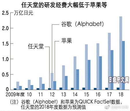 这些IT行业大型企业的资金实力遥遥领先于任天堂。谷歌母公司Alphabet最近的年均研发费用达到214.2亿美元(约合2.3776万亿日元,QUICK FactSet数据),而苹果为142.4亿美元(约合1.5806万亿日元,同上)。另一方面,任天堂的研发费用仅为700亿日元(2018财年预期)。任天堂的一把手表示,“必须比以往更加努力,否则我们的地位也并非坚如磐石”,危机感越来越强。