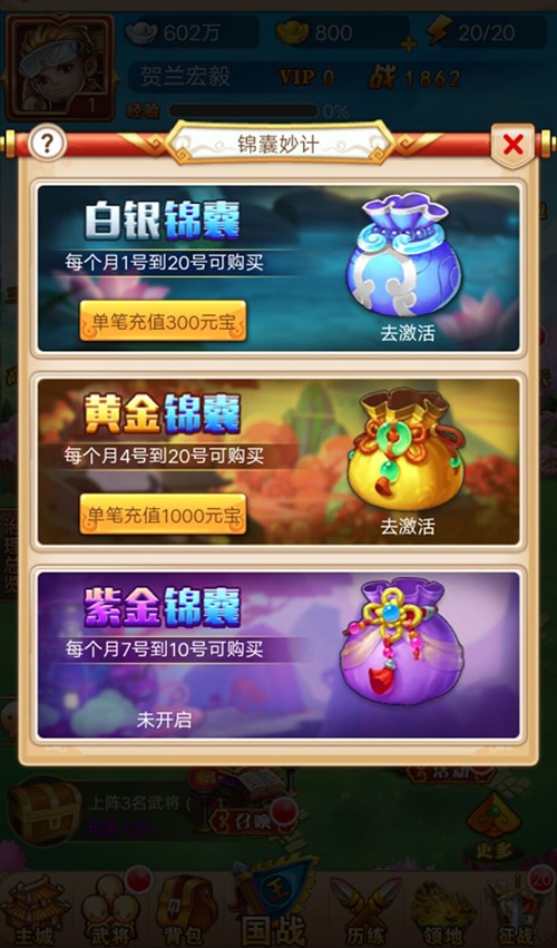 全新资料片中除新功能系统玩法外,还新增了周基金和锦囊妙计活动。周基金,小充一笔即可连续一周领取丰厚游戏奖励;锦囊妙计,单笔充值一定金额即有机会激活白银锦囊、黄金锦囊、紫金锦囊。激活锦囊后完成一定游戏活跃任务,就可以领取惊喜奖励!