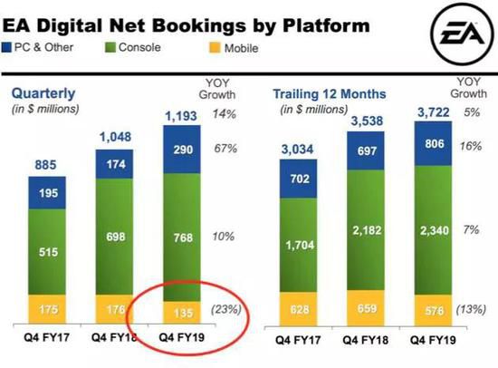 值得注意的是,这并不是整个行业的趋势。在美国,过去几年,Zynga(纳斯达克(7967.7585, 57.79, 0.73%):ZNGA)和Glu mobile(纳斯达克:GLUU)等纯手机游戏公司的营收增长速度惊人。EA几年前在手机游戏领域也做得很好。EA仍然拥有一些高质量的移动资产。国际足联(FIFA)、美国橄榄球联盟(NFL)的马登(Madden)、《模拟人生》(Sims)和《星球大战英雄星系》(Star Wars Galaxy of Heroes)等。
