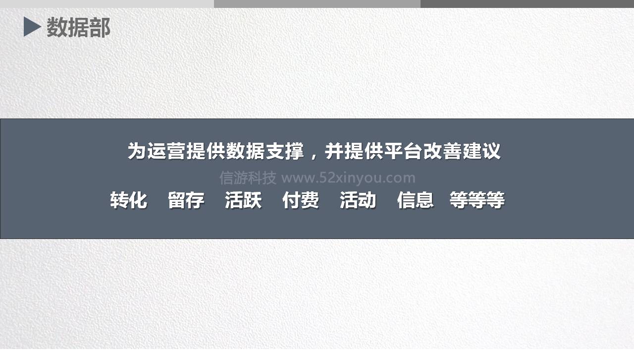 数据部一般只有特别大的团队才会设置这个部门,为运营提供数据支撑,并提供平台改善建议。分析转化率,转化率就是比如导入1000人有500人注册了,留存率就是昨天注册500今天还剩多少,活跃率是昨天的500人今天还来不来了,付费就是这500人有多少人付费了,活动结束后花了多少钱,注册了多少玩家,这些玩家后续充值有多少等;信息,玩家信息、竞争对手信息、上下游关系信息,整个市场信息产业报告等等。