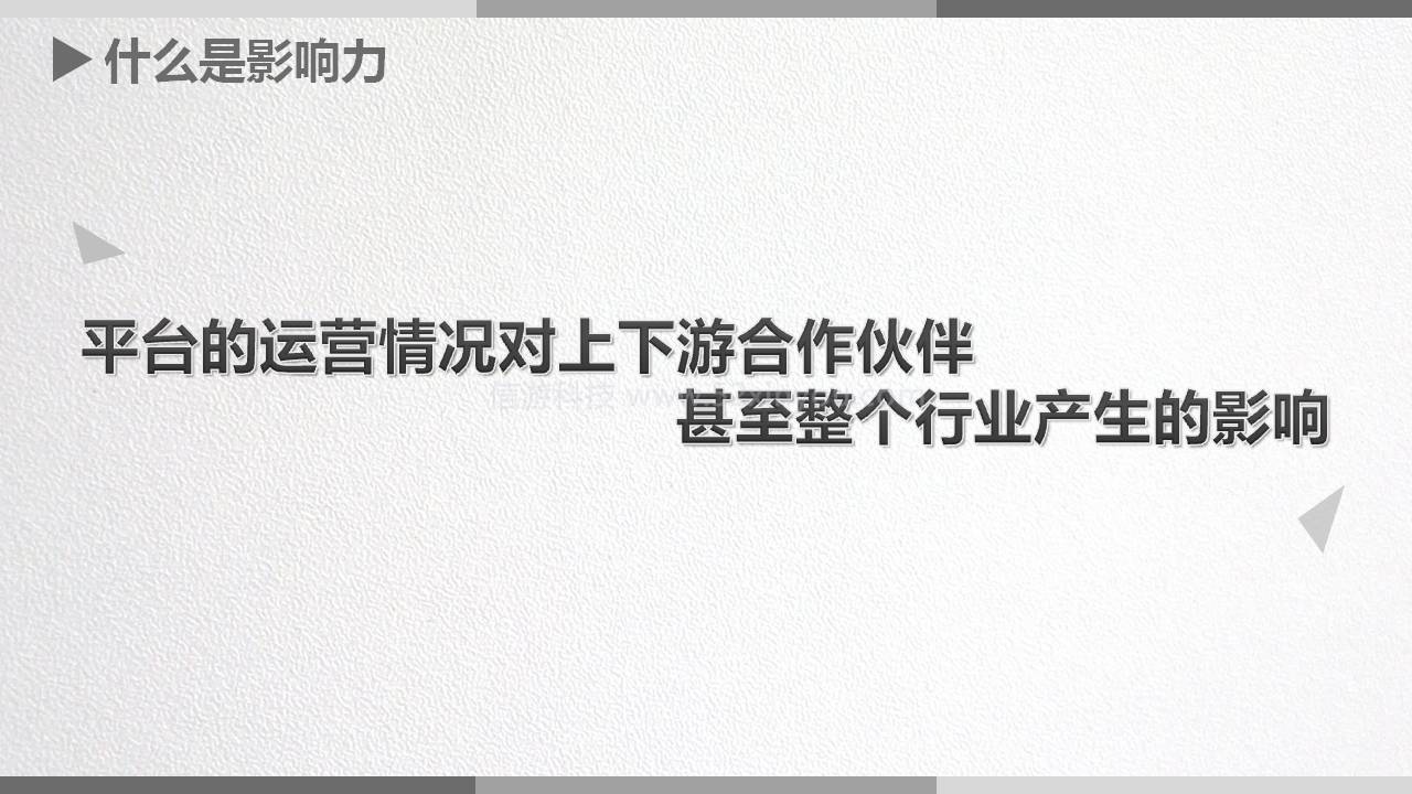 影响力就是平台的运营情况对上下游合作伙伴甚至整个行业产生的影响,你能影响到合作伙伴甚至整个行业,影响力的好处就不用多说了吧, 有名望有影响力的人可以怎么样呢 ?我们脑补一下是不是可以在行业内呼风唤雨呢。