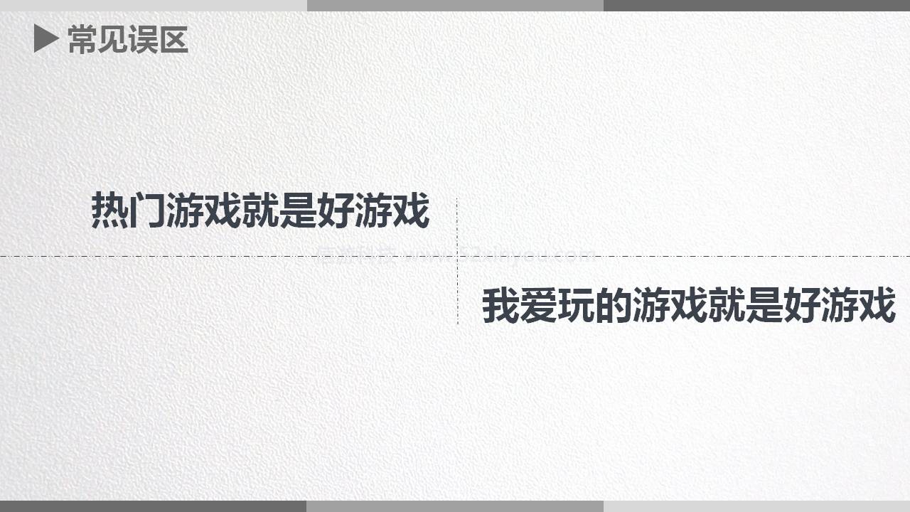2.我爱玩的游戏就是好游戏,如果你是一个运营上面还有大老板,他说这个游戏好好玩一定热门咱们要去代理他,这个时候你千万要冷静,并不是说老板爱玩的或者你爱玩的就是好游戏,尤其是不懂行的 ,没有听过咱们上面的分析方法的同学,你要时时刻刻的记住,你最多只能代表一类玩家 ,甚至你只能代表你自己 ,有时你连你自己都代表不了, 咱们的分析游戏质量好坏要从刚刚分享给大家的方法去分析,不要根据自己的喜好和市场的反响去分析 ,这样只会误导你,这就是咱们常见的误区。